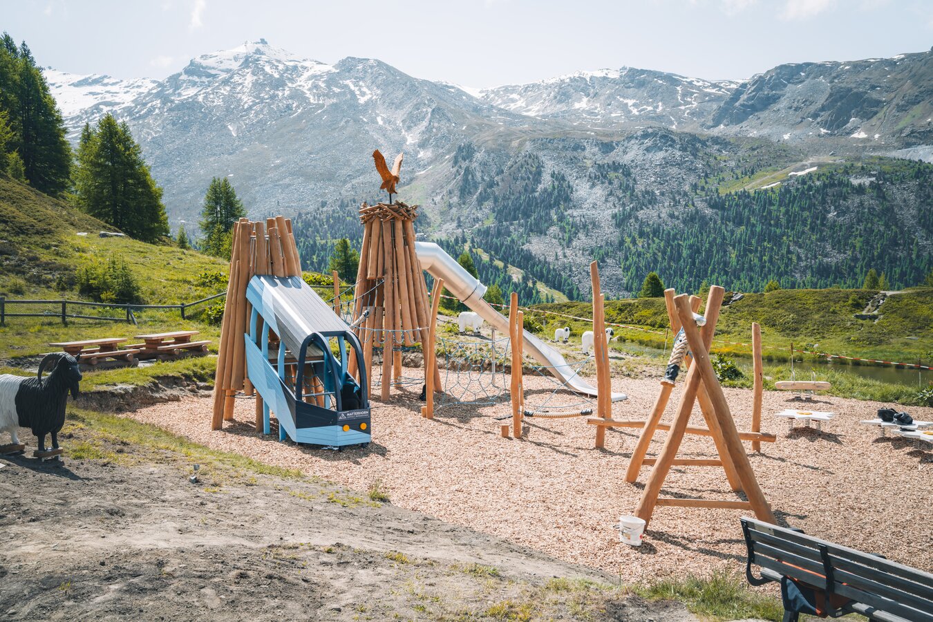 Das liebevoll durchdachte Konzept verbindet Spiel, Bewegung und Naturverbundenheit mit Liebe zum Detail. Harmonisch in die alpine Landschaft eingebettet, bietet der Spielplatz ein vielseitiges Erlebnis für die ganze Familie. Zahlreiche Spielstationen laden zum Toben und Entdecken ein: abenteuerliche Kletterelemente, bodenintegrierte Trampoline, Schaukeln, eine spektakuläre Rutschbahn sowie dekorative Tierfiguren aus der Region – darunter das Walliser Schwarznasenschaf, die Schwarzhalsziege, ein Adler und ein Murmeltier. Ein besonderes Highlight ist die originelle Inszenierung der Standseilbahn Sunnegga, die auf spielerische Weise eingebunden wurde und den Entdeckergeist der Kinder weckt.